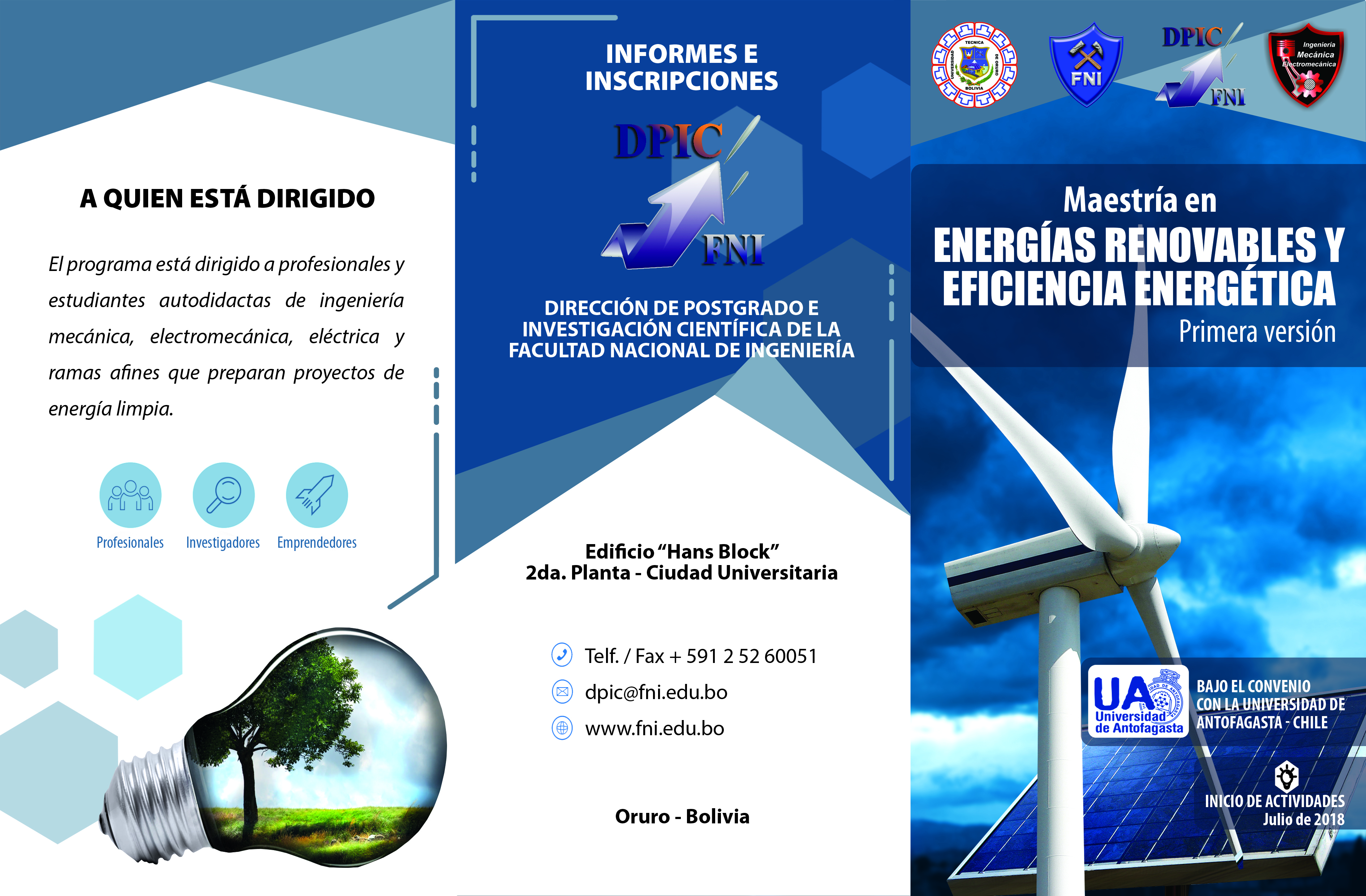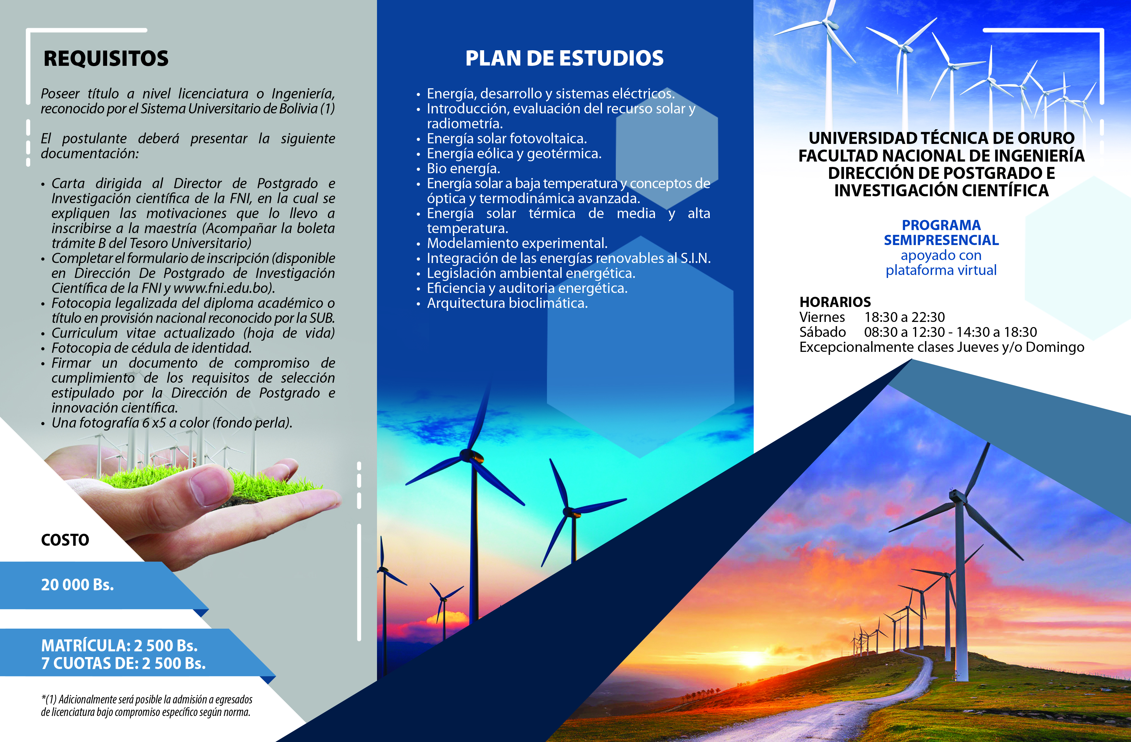 Se presenta como una necesidad de la Universidad Técnica de Oruro, de iniciar un programa formativo de Maestría especializado en Energía Renovable y Eficiencia Energética, y que de esta forma contaría con la consolidación de esta temática energética, demandada por las empresas y la misma sociedad critica además se cuentan con el apoyo de investigadores que han desarrollado su actividad investigativa en esta materia.
